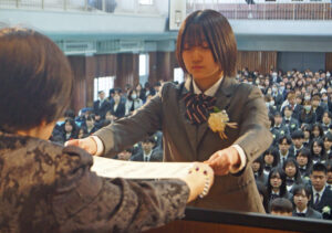 岩武茂代校長が各クラスの代表者に卒業証書を手渡して「皆さんが明豊で培った力は、これからも皆さんの中で生き続け、皆さんの人生に大きな実りをもたらせてくれるものと信じています。これからの時代は、正解のない課題が次々と現れてくると思います。そのような時代を生き抜くために必要な物は、他者から与えられたものではなく、自らに芽ばえて実現するスキルや能力です。高く豊かな力で果敢に挑戦し、決して諦めずに未来へ進んでほしい」と式辞。