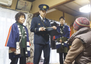 2日は、市消防本部予防課職員と女性防火クラブ員が防火訪問し、コンロやストーブなどの暖房器具周辺が片づけられているかを確認し、住宅用火災警報器の設置場所を質問されたので予防課職員が丁寧に応えていた。