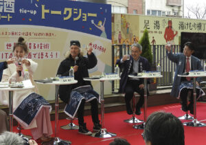 タレントの倉本康子さん、自身も酒米を栽培して酒づくりをしているマーク・パンサーさん、酒造組合から久家会長(株式会社久家本店代表取締役)、西和紀副会長(三和酒類株式会社代表取締役)が登壇。久家会長が酒づくりについて説明をした。倉本さんは「先人が伝統を守ってくれたから、おいしいお酒を飲める。知れば知るほど、感謝の気持ちで飲める」。マークさんは「日本酒は、口の中で化学反応をおこして、新たな味になる」とそれぞれ話した。おいしく日本酒を飲む2人に、西副会長は「一生懸命つくって、おいしいと言ってもらえるのが、最高の喜び」と笑顔で答えた。