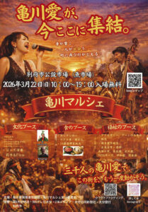 「亀川愛が、今ここに集結。~音が響く、人が出会う、町に再び灯がともる~」として、食、文化、福祉の3つのブースを設けて、それぞれ同じ空間、同じ時間で体験できるマルシェを実現する。