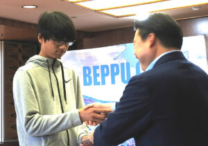 別府市にあるSOLAテニスアカデミーに所属する、則本拓真選手(別府西中学校2年生)は10日午後5時、長野恭紘別府市長に全国大会出場を報告した。