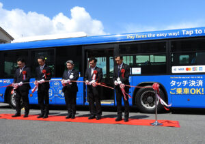 亀の井バス(本田哲社長)は、21日から全21路線53両にクレジットカードなどのタッチ決済による乗車サービスを始める。全路線バスに導入するのは、大分県内で初めて。13日午後1時、亀の井バス本社で導入セレモニーが行われた。