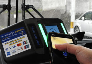 今回導入するのは、三井住友カードが展開する「stera transit」。全国に展開しているサービスで、導入事業者は亀の井バスで225事業所目だが、路線バス全線に導入しているのは、全国的にもまだ少ないという。タッチ決済対応のクレジットカードやスマートフォンを専用端末にかざすことで乗車できる。交通系ICカードと同様に、乗車する際と降車する際にタッチする。クレジットカードだけでなく、デビットカード(使用すると銀行口座から即時に引き落とされる)、プリペイドカードでも利用できる。また、専用サイトで乗降履歴をみることも可能。