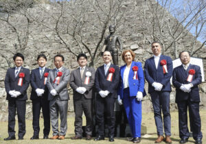 式典の前には、城下公園でピント像のお披露目があり、安部町長、ジェロニム大使、リベイロ市議、ヌーノ・サンタ・リタ市長補佐官、金元正生町議会議長、三浦県議、濱田英彦2025年大阪・関西万博首長連合特別顧問が除幕した。