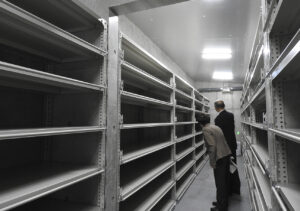 集合安置室には棚が並び、