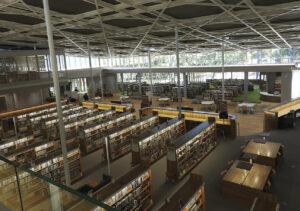 本が並び、開館を待つ市立図書館