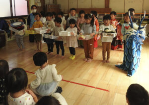以前の園長が由布市出身で、神楽を舞えたことがきっかけで、子どもたちに神楽を教えるようになり、年長から年少へ、道具を引き継ぐとともに、思いも一緒に引き継いできた。