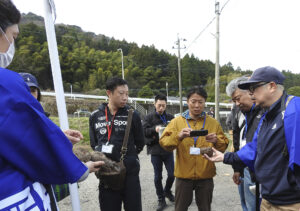 もみじハウスでは、ハウスの中に温泉熱を利用してキクラゲが栽培されている様子を見学し、収穫体験もさせてもらった。天間こんにゃくでは、これから種芋を植える準備が行われている畑を見学。久保賢一天間自治会長が「まだまだ手探りだが、みんなでこんにゃく芋の栽培、加工をしている」と説明。「Fish on天間」では、大きく育ったヤマメやニジマスの様子や平飼いをしている鶏を見学。収穫したキクラゲや自分たちで釣った川魚などを焼いて味わった。