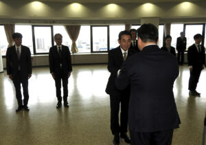 市長部局で退職する6人に対して、長野恭紘別府市長が一人ひとりに退職辞令を手渡して、握手を交わし「長きにわたり、市政発展のため、市民の幸せのために働いていただき、ありがとうございました。市役所で多くの同士と共に戦い、過ごしてきた日々は一生消えるものではないと思います。市役所で培った様々な経験を生かして、健康に留意し、これからのチャレンジ、幸せな人生設計をたててほしい」とあいさつ。