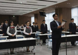 新入職員を代表して、園田遥人さん(日出支店)が▽常に誠実な姿勢を忘れず、お客さまから信頼される職員になる▽地域社会とのつながりを大切にし、大分の発展に貢献するため責任ある行動をとる▽向上心を持ち続け、質の高い金融サービスを提供する、との宣言文を読み上げた。