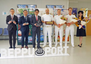 最後にウェルヘイム船長が「クリスタル・シンフォニーは日本とつながりが深く、1990年に日本の造船会社で造られました。イエガーは船を造った人でもあります。日本との関係性も深いクリスタル・シンフォニーが、別府に寄港させていただいたことに非常に光栄に思います。これから二度、三度と続くように我々も願っています」とあいさつし、式典を終了した。