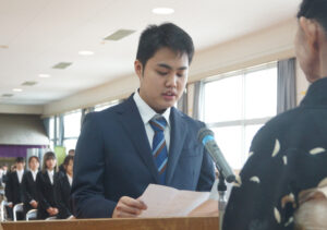 最後に、新入生代表の野上颯斗さん(18)が「伝統ある大分県歯科技術専門学校に入学を許可されました。入学生一同、このことを光栄に思い、感激でいっぱいです。これからは学則を守り、歯科技術の取得に励みます」と宣誓した。