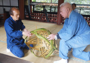 2人は、幅2・7㌢、長さ3㍍のマダケのヒゴ16本を力強くかつ手早く編み、幅55㌢、高さ40㌢の「大四海波」を完成させた。それを見ていた出席者から大きな拍手が贈られた。