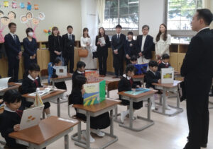 国歌斉唱後、米持校長が「創立から80年を迎えました、明星小学校、第19代校長の米持でございます。みなさんは、今日から85期生です。そして今年の入学式は、明星小学校ができて80回目の、とても特別な日です。この学校を創った人たちや、それを引き継いできた人たちは、『子どもたちが未来を切りひらく力を育てたい』と願っていました。その思いは、今でもずっと続いています」