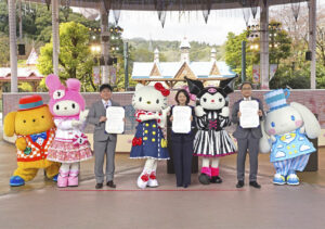 永松市長は「誰もが楽しめるハーモニーランドになるように、日々進化するハーモニーランドに期待したい」。安部町長は「ハーモニーランドは今年35周年で、日出町民にとっては身近な存在で、宝物といっても過言ではない。杵築市との協力も欠かせない。全力でエンタメリゾート化に取り組みたい」。小巻社長は「サンリオが掲げる『みんななかよく』の1つの形。大きな輪となって、大分県全体、日本全体、世界全体に広がっていけばと思う」とそれぞれあいさつした。