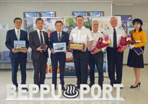 岩田副市長とデニスオフ船長、黒川一也ツーリズムおおいた誘致営業部長とデイビッド・フレミングチープパンサー、小野正明別府市議会議長とアントニー・チョリーホテルマネージャーがそれぞれ記念品を交換した。