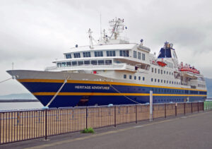 クルーズ客船「ヘリテージ・アドベンチャラー」(8445㌧、全長122・73㍍、幅18㍍、ポルトガル船籍)が14日午前8時30分、別府国際観光港第4埠頭に初寄港した。午後5時、萩港に向けて出発した。