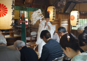 安全祈願祭が午前10時から行われ、24人が出席。北崎宮司が祝詞を奏上。清祓などを斎行し、山名義弘さん、西田陽一さん、日名子敦子さんら24人が玉串を捧げた。