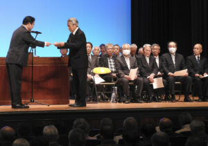 長野恭紘別府市長が17地区の代表者に委嘱状を手渡して、「新任が25人いらっしゃり、地域発展のために共に務めてもらいたい。継続される自治委員の皆さんには、日頃から地域のために昼夜を分かたず活動してもらっています。共通の課題は、担い手不足、自治会への未加入など。今まで自治委員の皆さんはもちろん、自治会としても中心となって様々な課題をクリアしてきた。しかし、今までのように行政は行政の仕事しか果たさないのでは、地域の課題は解決できないことが多くなってきたと思う。県東部振興局とも話をし、問題意識は県も共有している。出来る限り以上の力を出して、共に地域のこれからの未来のために頑張っていきたい。引き続き、地域と行政のパイプ役を務めてもらいたい」とあいさつ。